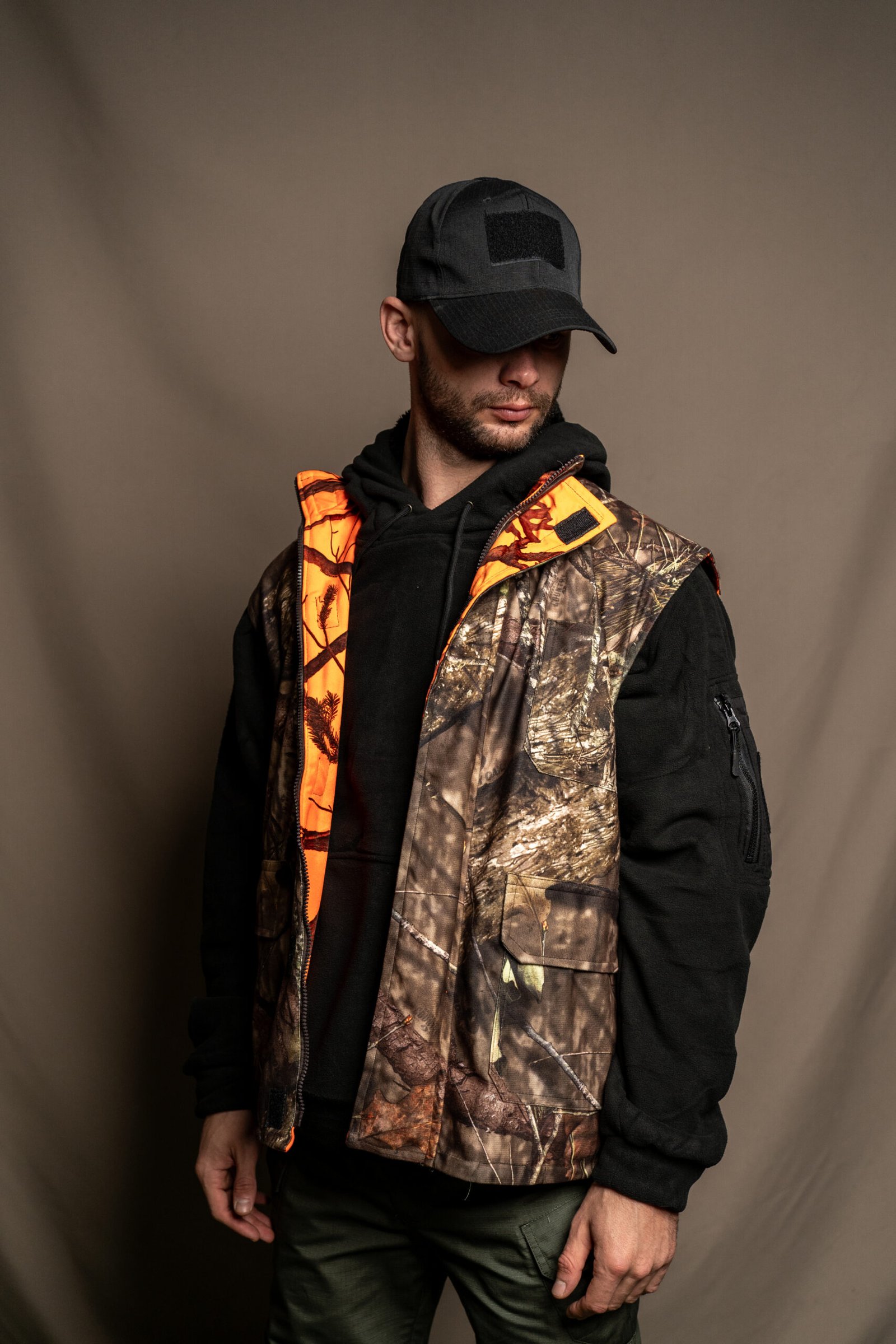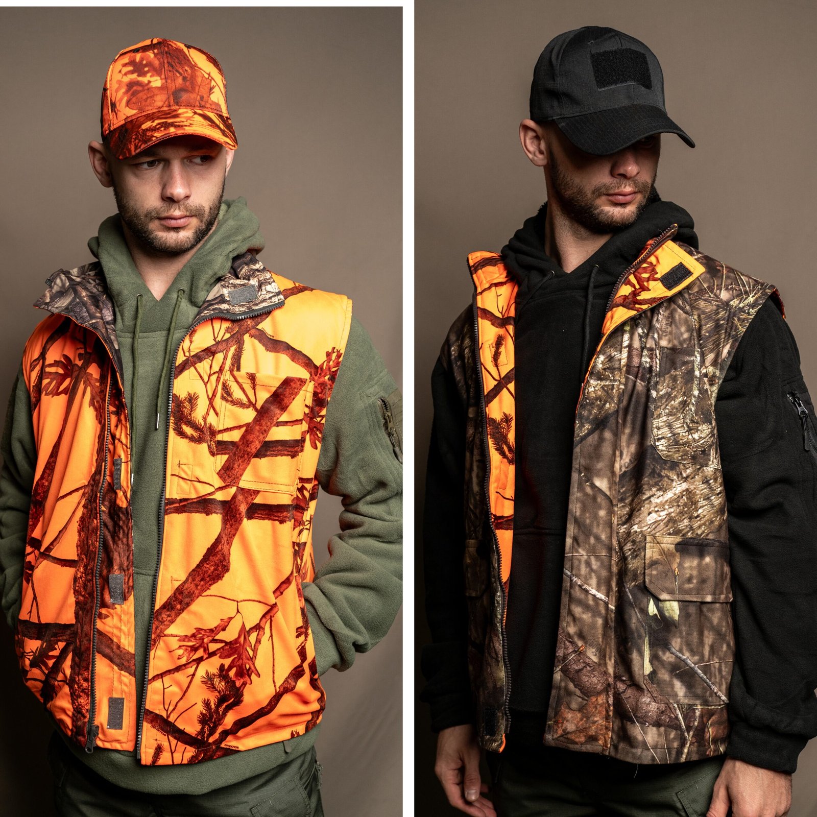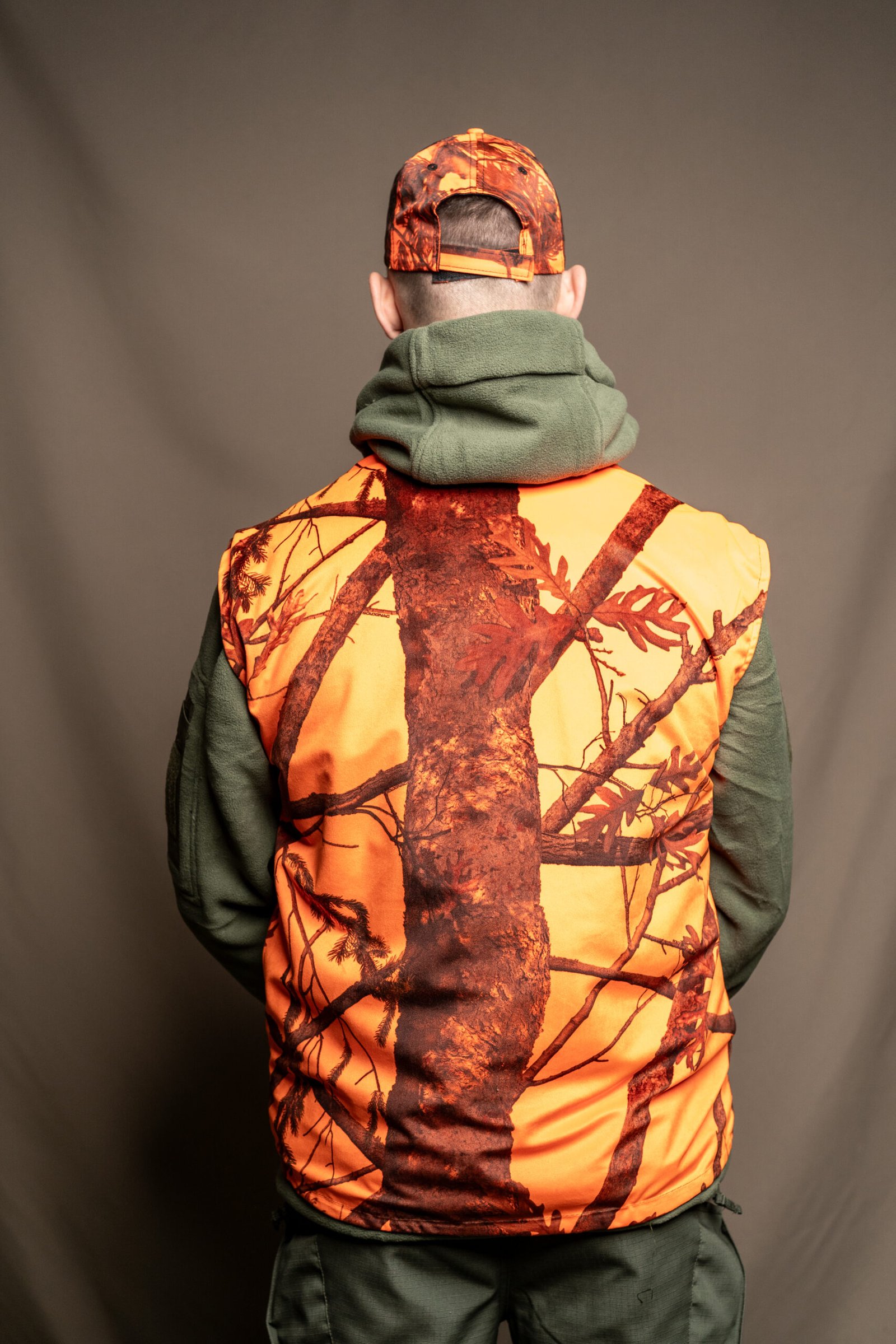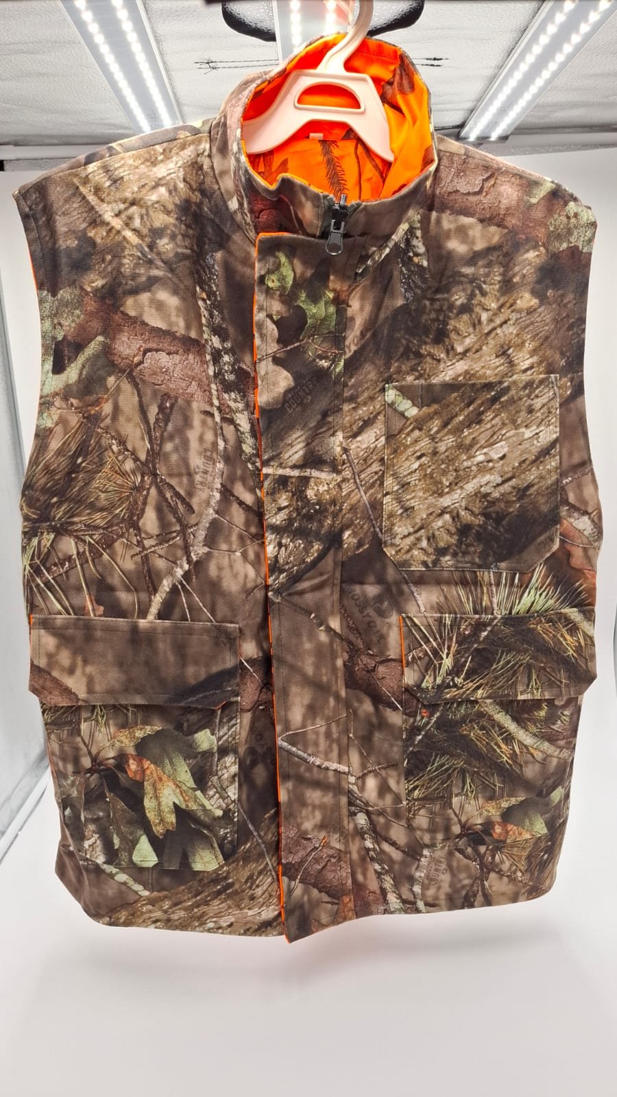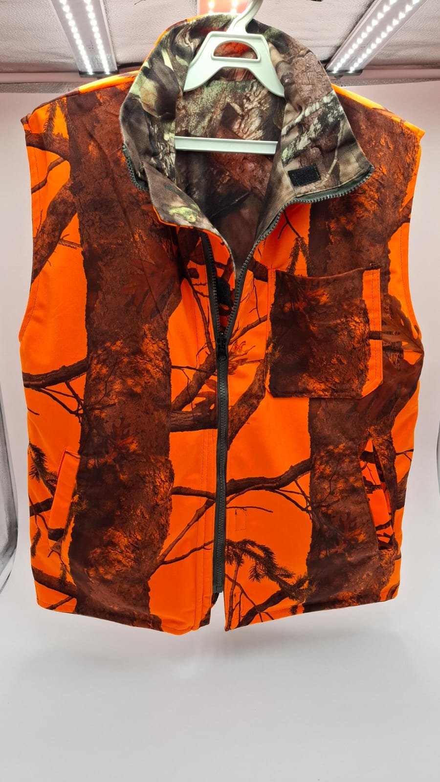 Chaleco de doble cara: color naranja de una cara y color camuflaje de otra cara.
