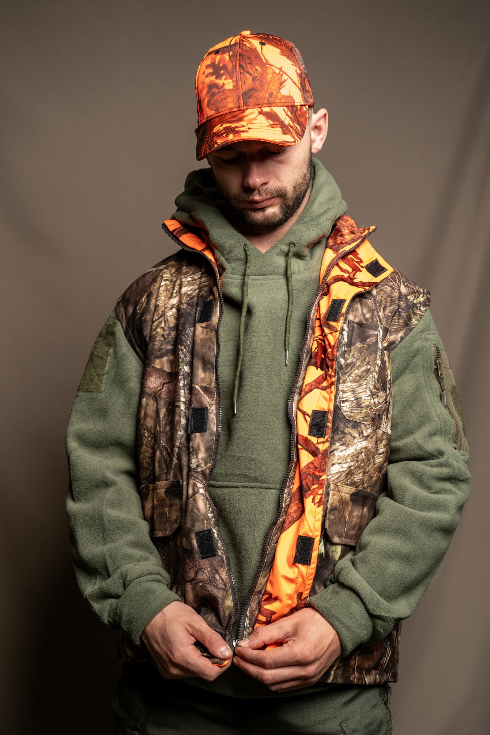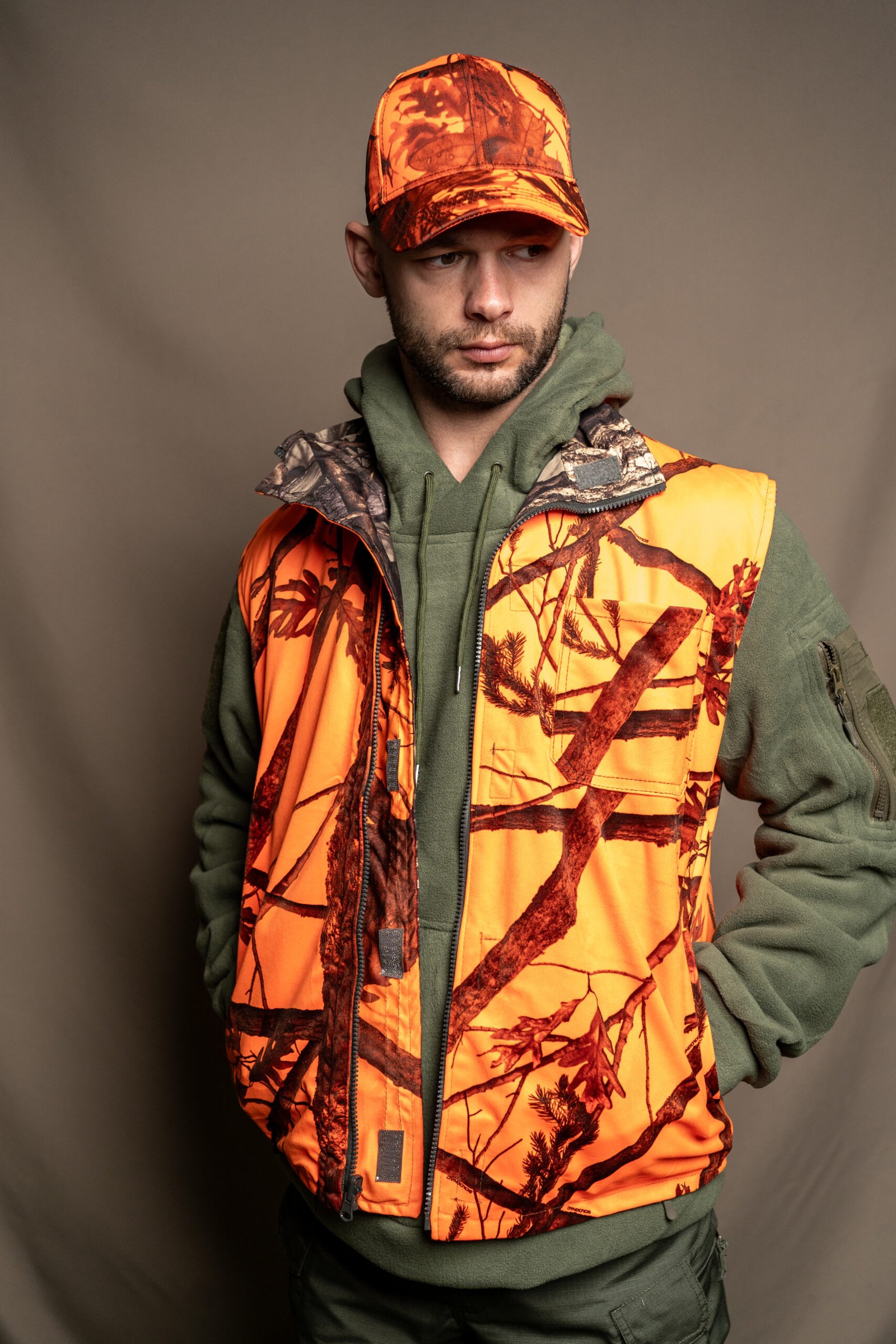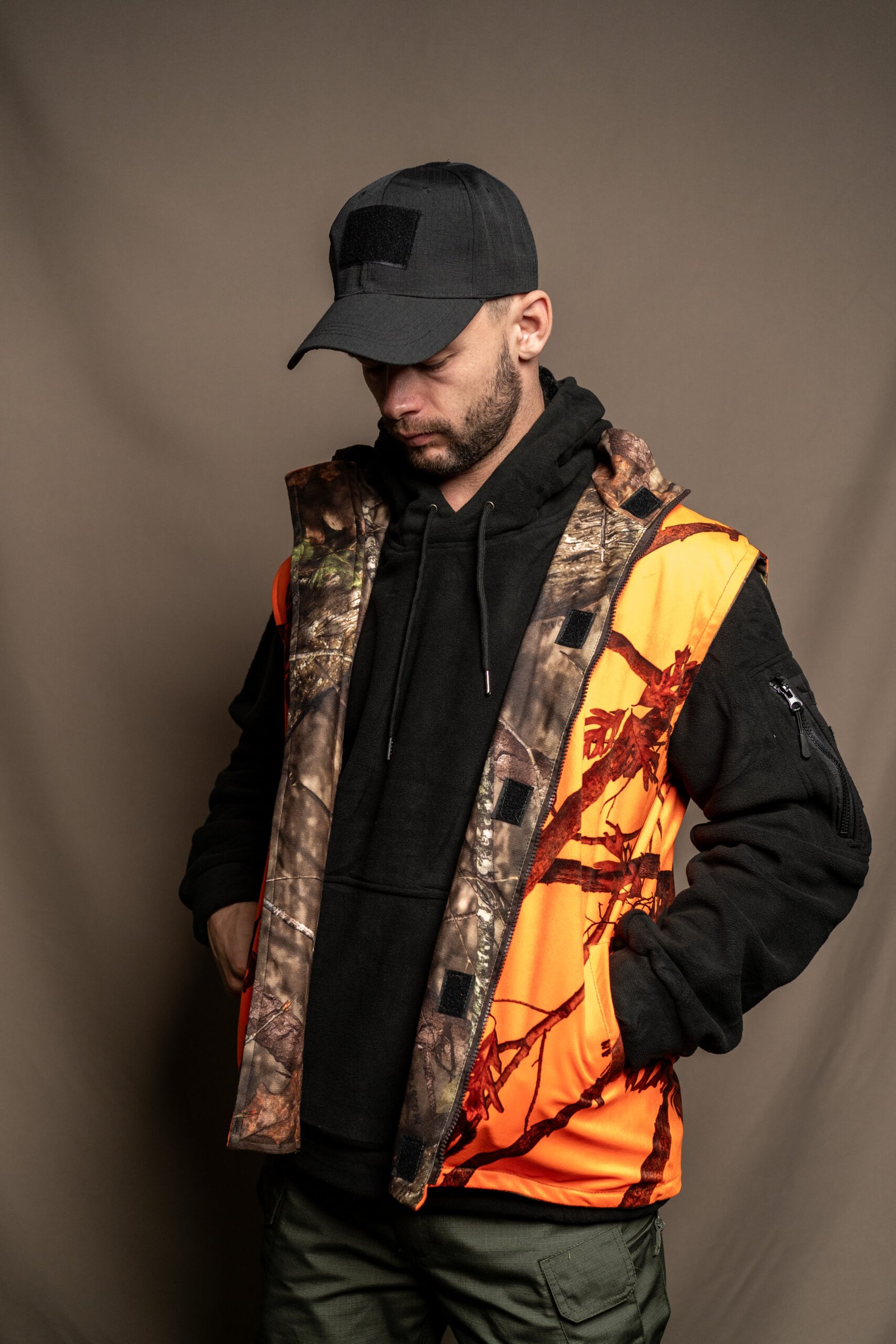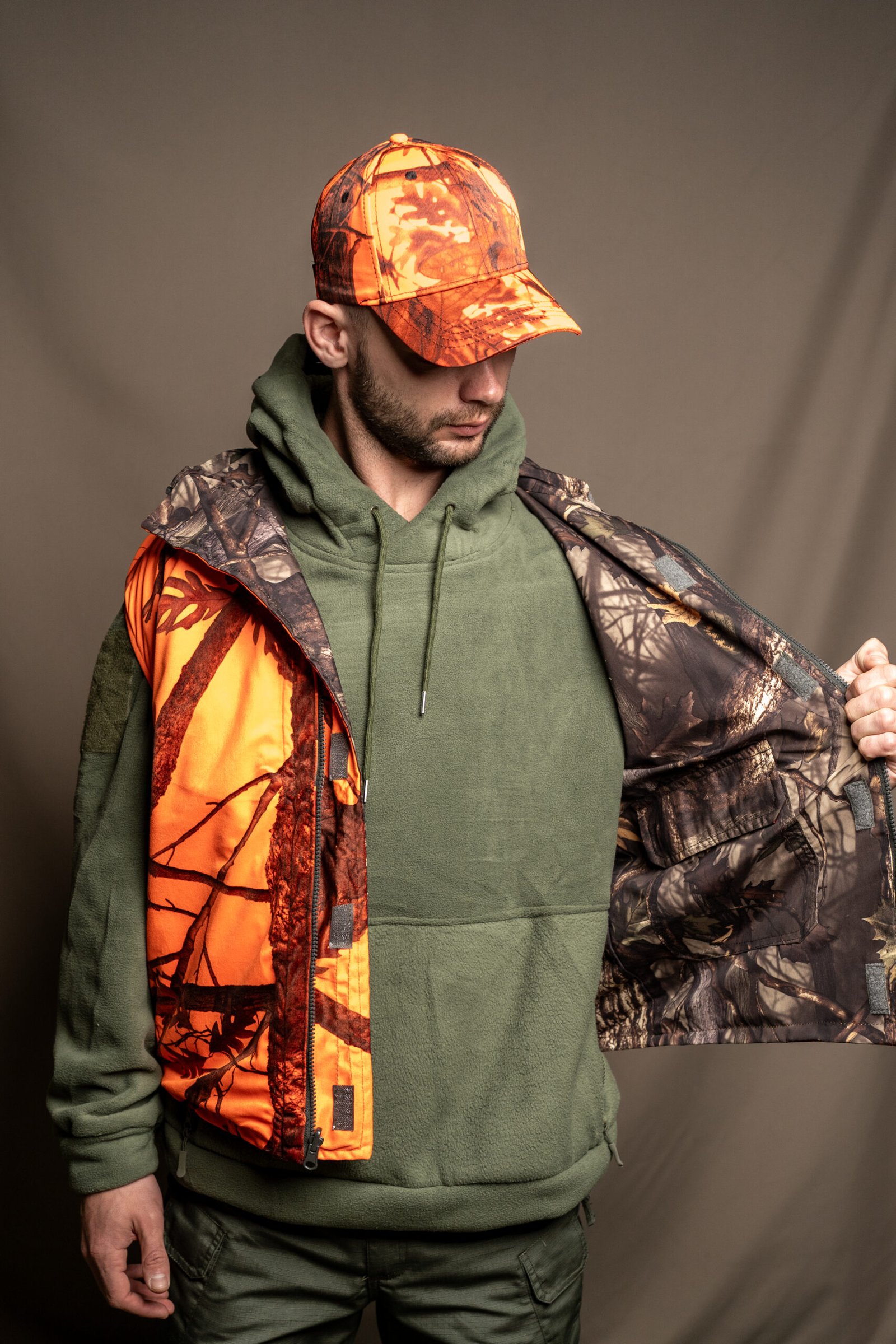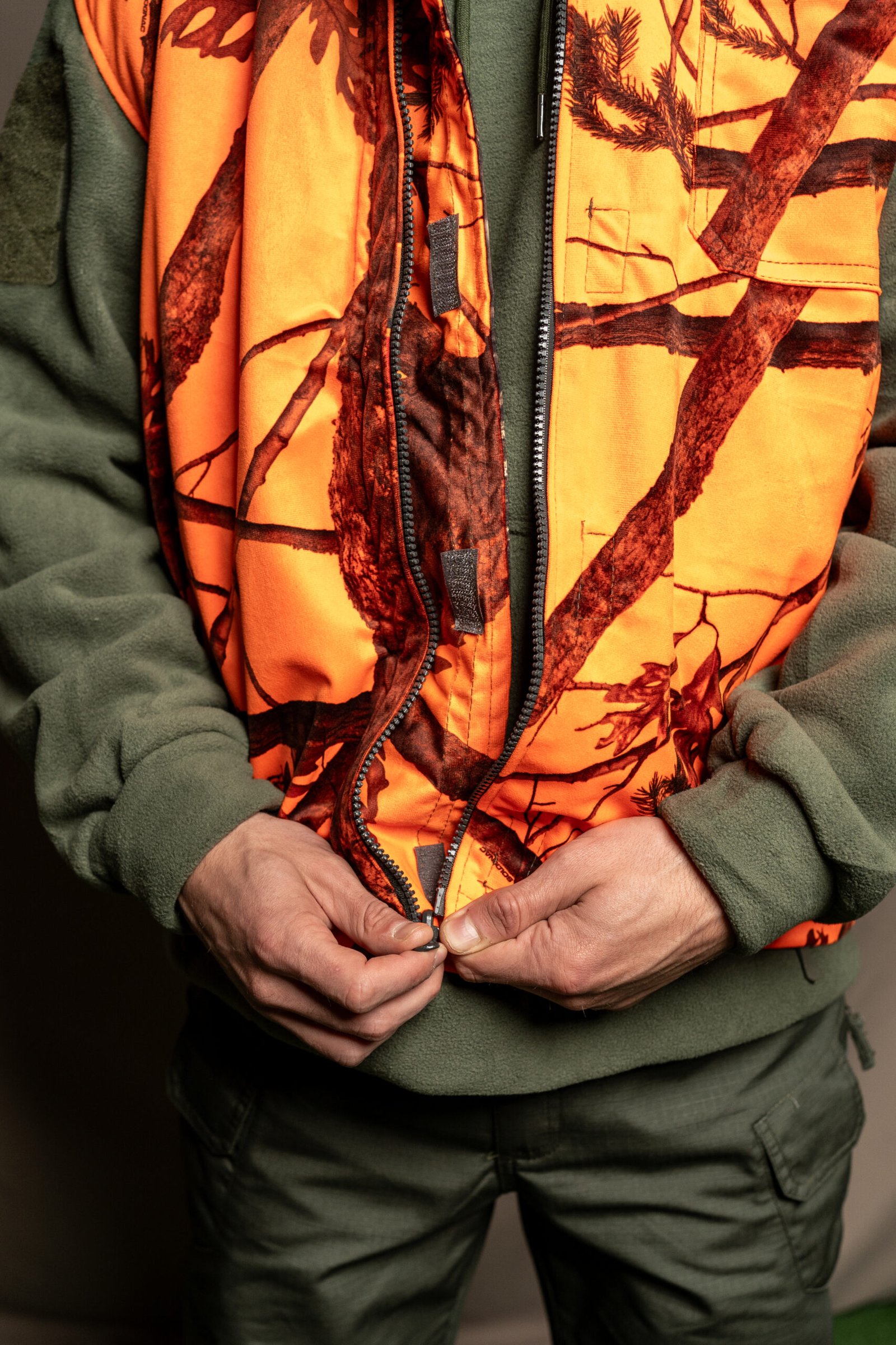 Chaleco de doble cara: color naranja de una cara y color camuflaje de otra cara.